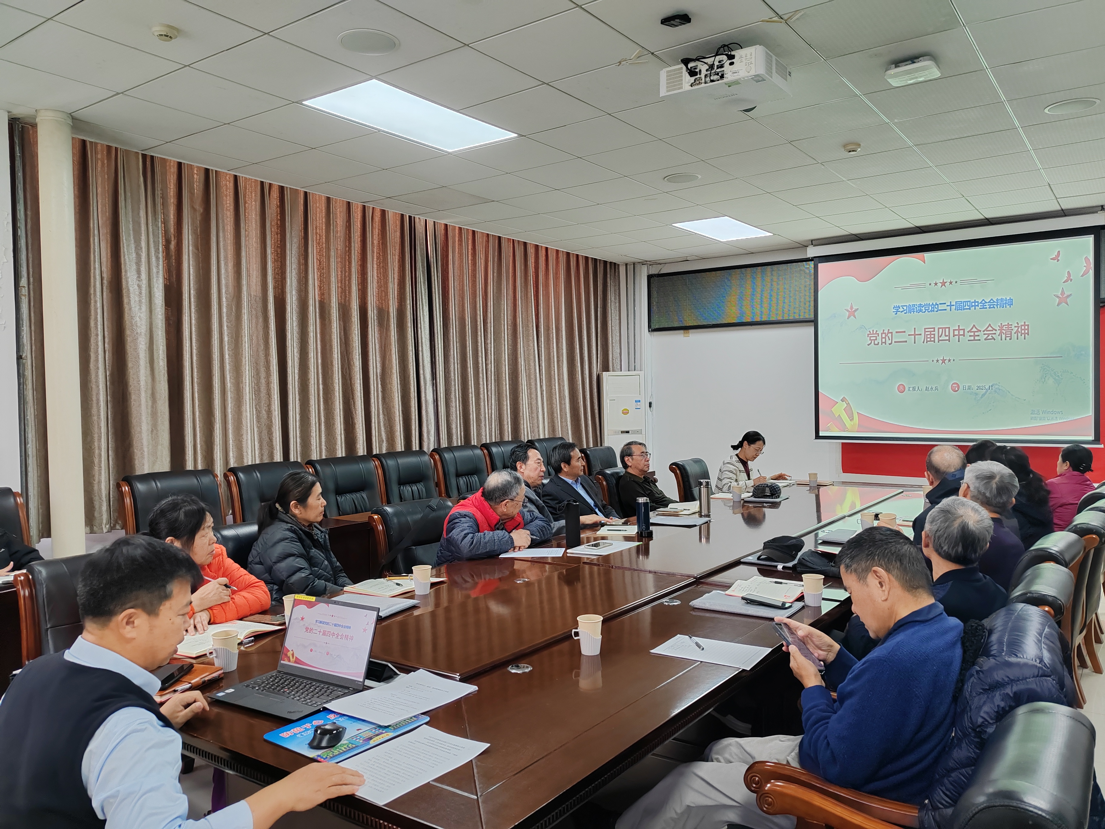 赵永兵讲授党课,深入学习解读党的二十届四中全会精神,并对学校及离退休党委学习、贯彻和落实党的二十届四中全会精神的相关工作作出部署。随后,全体人员集体学习了《中国共产党普通高等学校基层组织工作条例》《中国共产党思想政治工作条例》。